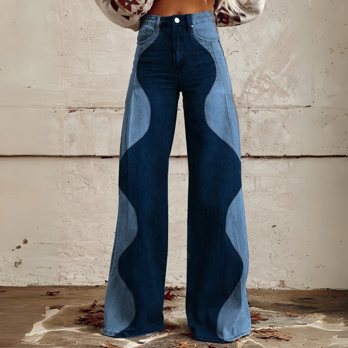 Diese hochgeschnittene Hose besticht durch ein auffälliges wellenförmiges Design mit markantem Kontrast. Der weite Schnitt sorgt für eine fließende Silhouette, während der strukturierte Bund mit Knopf- und Reißverschluss sicheren Halt bietet. Sichtbare Nähte unterstreichen das Design und setzen modische Akzente.