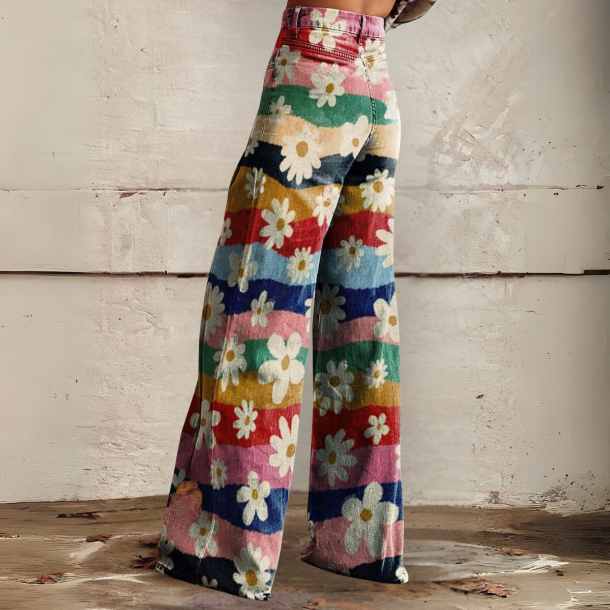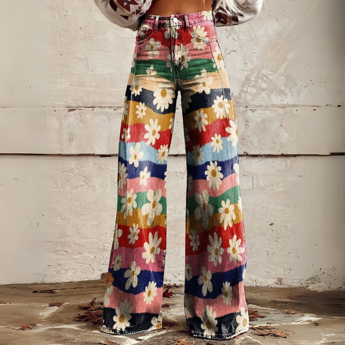 Diese weit geschnittene Hose zeichnet sich durch ein auffälliges Blumenmuster mit markanten Elementen aus. Der hohe Bund sorgt für eine strukturierte Passform, während der Knopf- und Reißverschluss einen sicheren Halt bietet. Die volle Länge erstreckt sich bis zum Saum und schafft einen fließenden Effekt.
