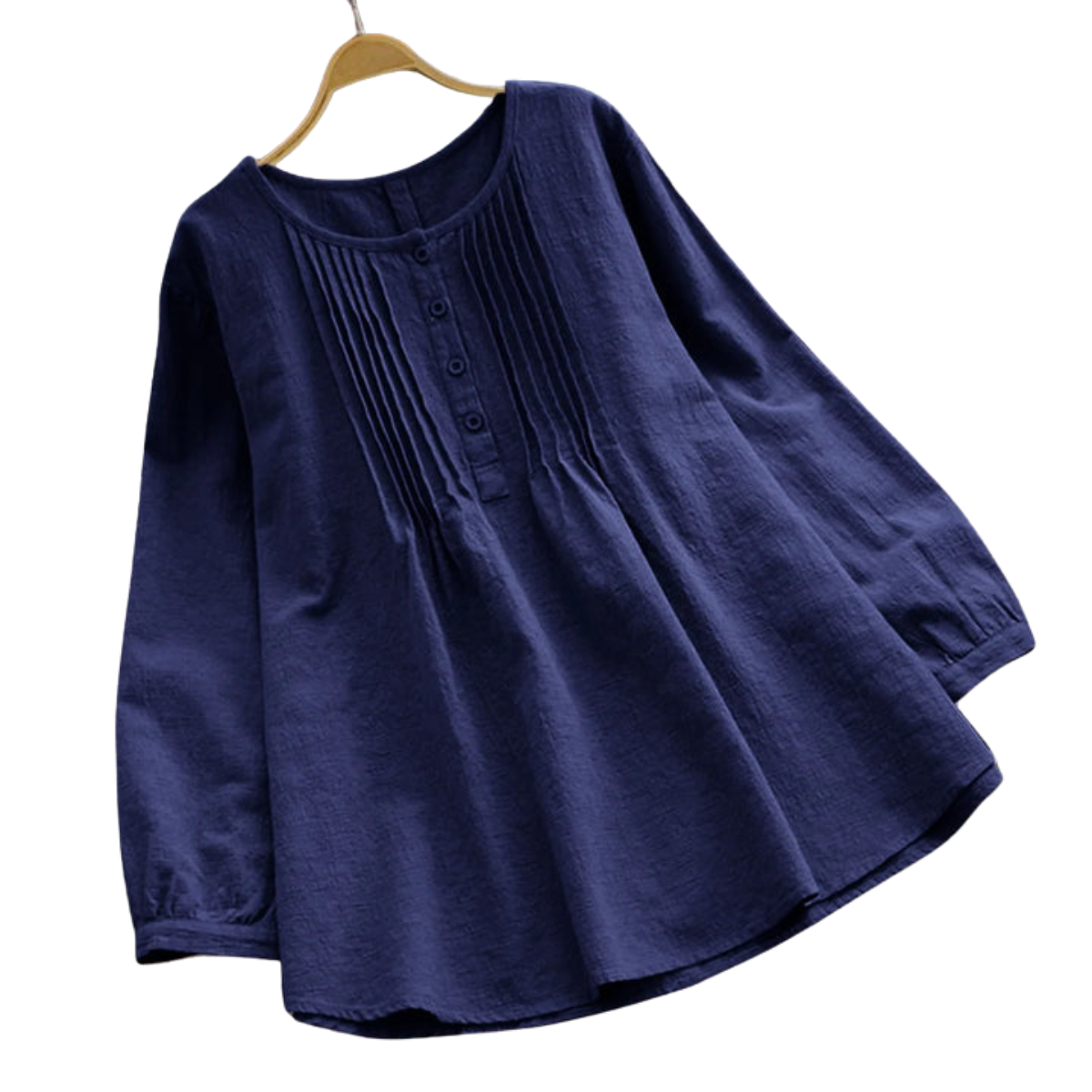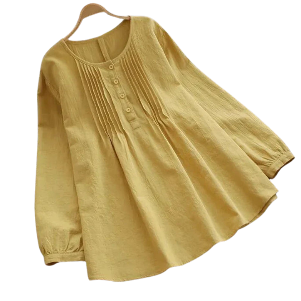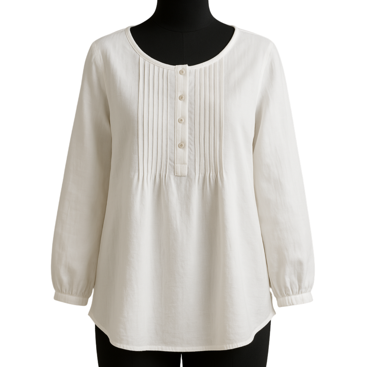 Diese Bluse hat einen runden Ausschnitt und vertikale Falten entlang der Knopfleiste. Vorne sind fünf Knöpfe gleichmäßig vom Ausschnitt bis zur oberen Taille angebracht. Die langen Ärmel enden in elastischen Bündchen mit leichter Raffung. Der Saum ist leicht abgerundet.