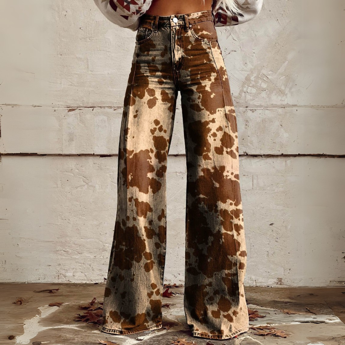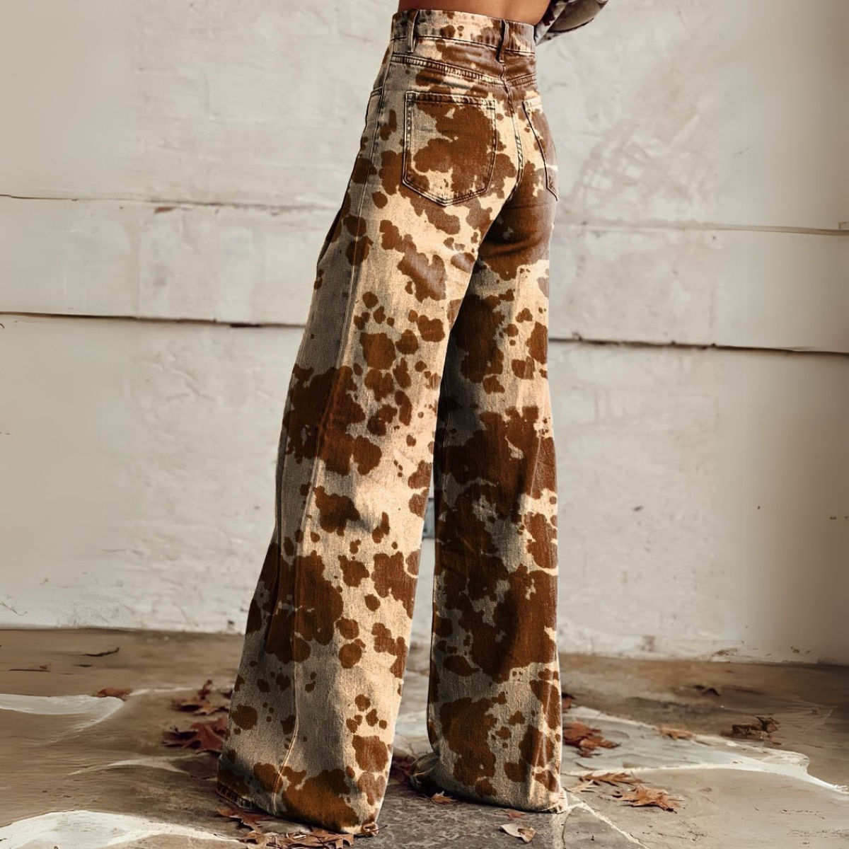 Diese weit geschnittenen Hosen haben eine hohe Taille und ein auffälliges Allover-Muster. Die strukturierte Form wird durch ein klassisches Fünf-Taschen-Design und einen sicheren Knopfverschluss ergänzt. Die locker geschnittenen Beine setzen ein Statement und verleihen dem Outfit eine markante Note.