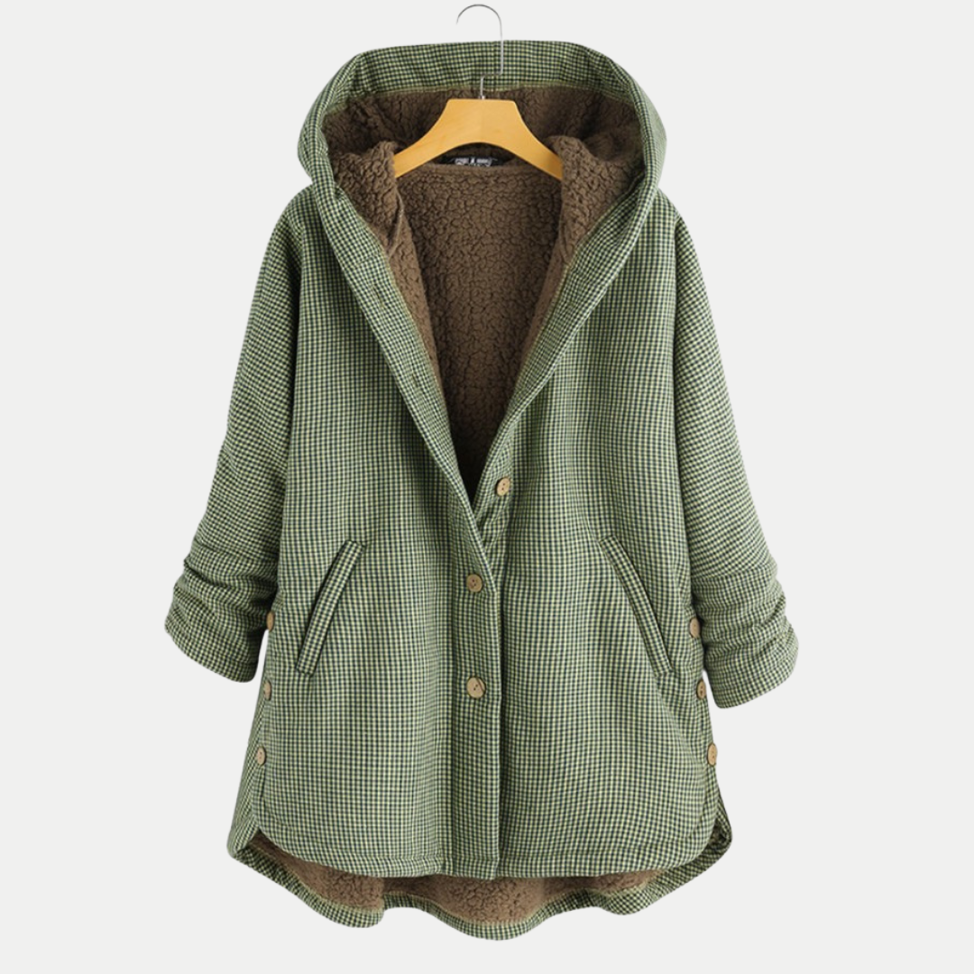 Dieser Mantel hat eine lockere Passform mit Kapuze und Knopfverschluss vorne. Das durchgehende Karomuster verleiht ihm eine klassische Note. Er verfügt über zwei Seitentaschen, lange Ärmel und einen leicht abgerundeten Saum für eine harmonische Silhouette.