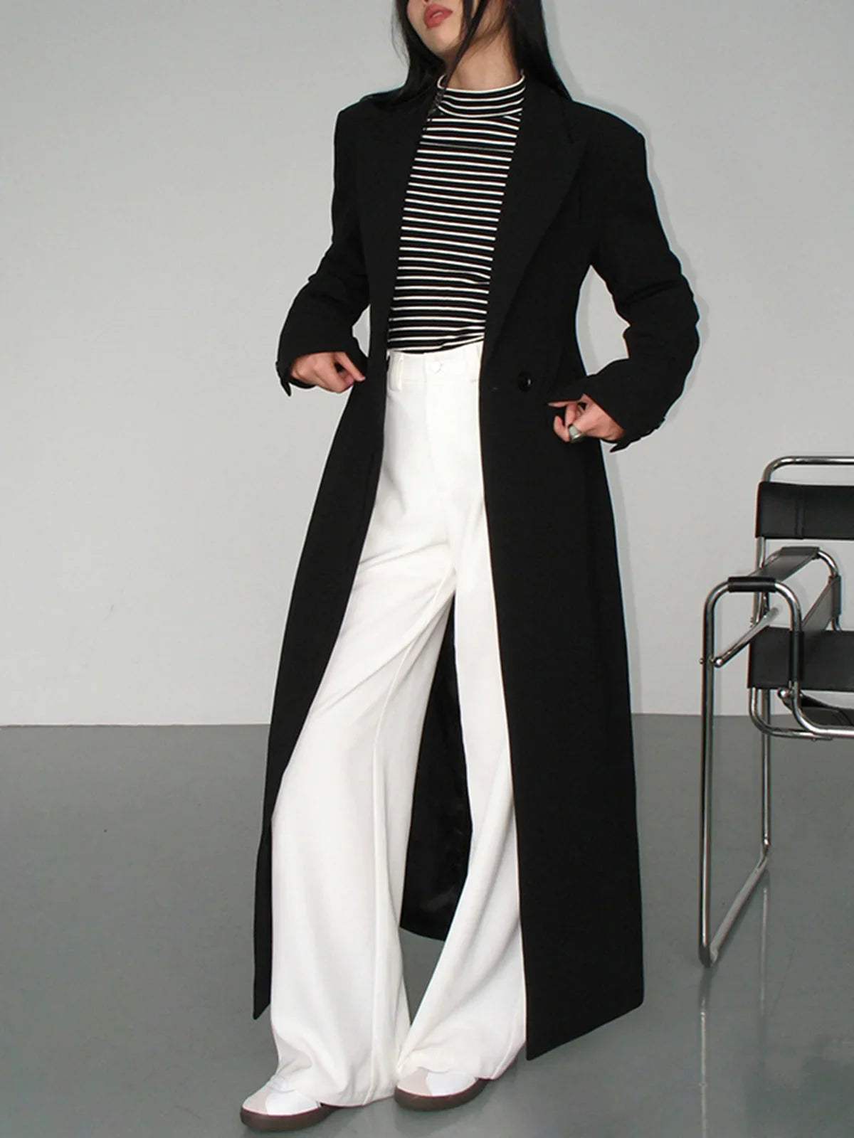 Langer schwarzer Damenmantel mit modernem Design