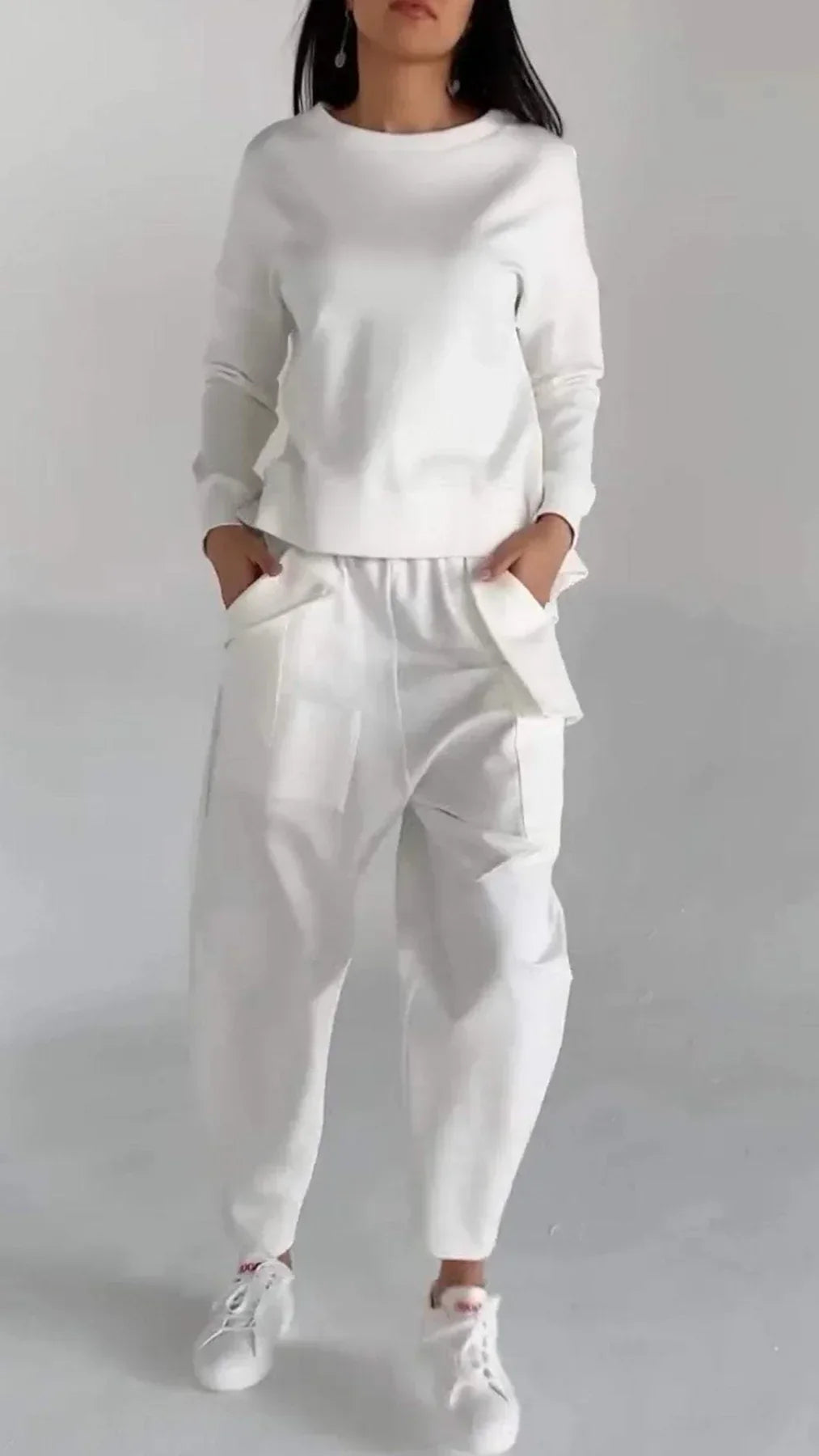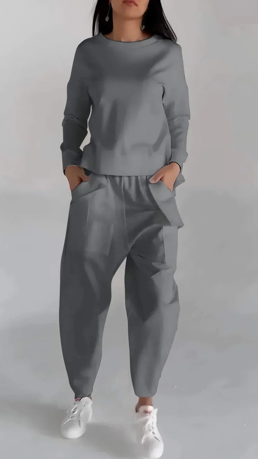 Lässiger zweiteiler mit rundhalsausschnitt und langen armeln