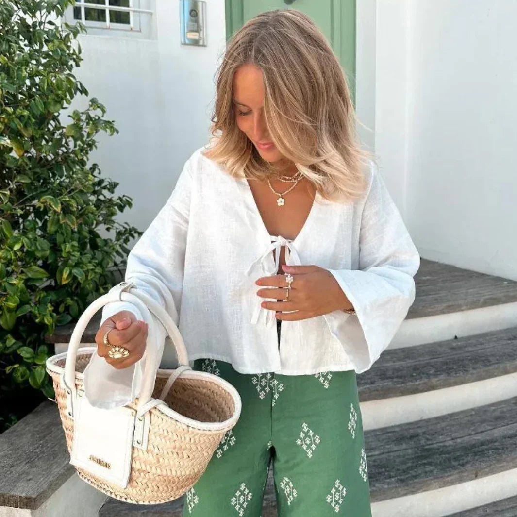 Dieses Leinenhemd mit Schnürsenkeldetails kombiniert lässigen Komfort mit einem Hauch von Boho-Chic. Der leichte Stoff sorgt für angenehme Luftigkeit, während die Schnürsenkel dem Design eine besondere Note verleihen. Ideal für entspannte, stilvolle Looks im Sommer.