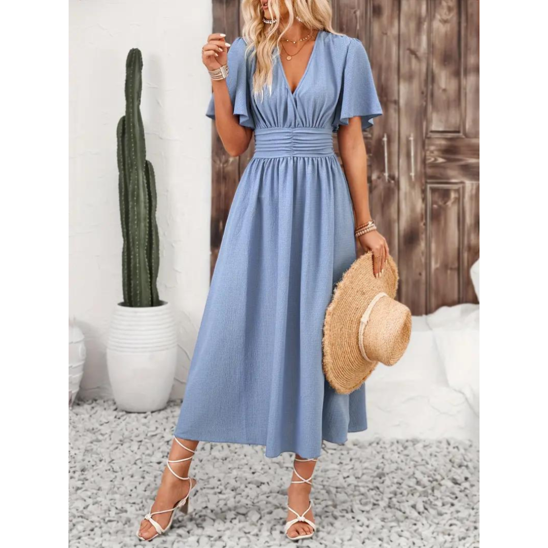 Dieses Kleid zeichnet sich durch einen V-Ausschnitt und kurze, schwingende Ärmel aus. Die Taille ist gerafft, was zu einem fließenden Effekt führt, der bis zum Boden reicht. Es ist so gestaltet, dass es eine elegante und luftige Ausstrahlung bietet, die für verschiedene Anlässe geeignet ist.