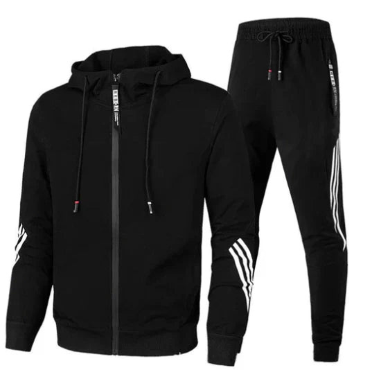 Dieser Herren-Trainingsanzug besteht aus einer Kapuzenjacke mit Reißverschluss und passenden Jogginghosen mit Streifendetails an Ärmeln und Beinen. Die Kapuze verfügt über eine verstellbare Kordel und gerippte Bündchen, während die Hose mit einem elastischen Bund und einer Kordel ausgestattet ist. Praktische Reißverschlusstaschen runden das Design ab.